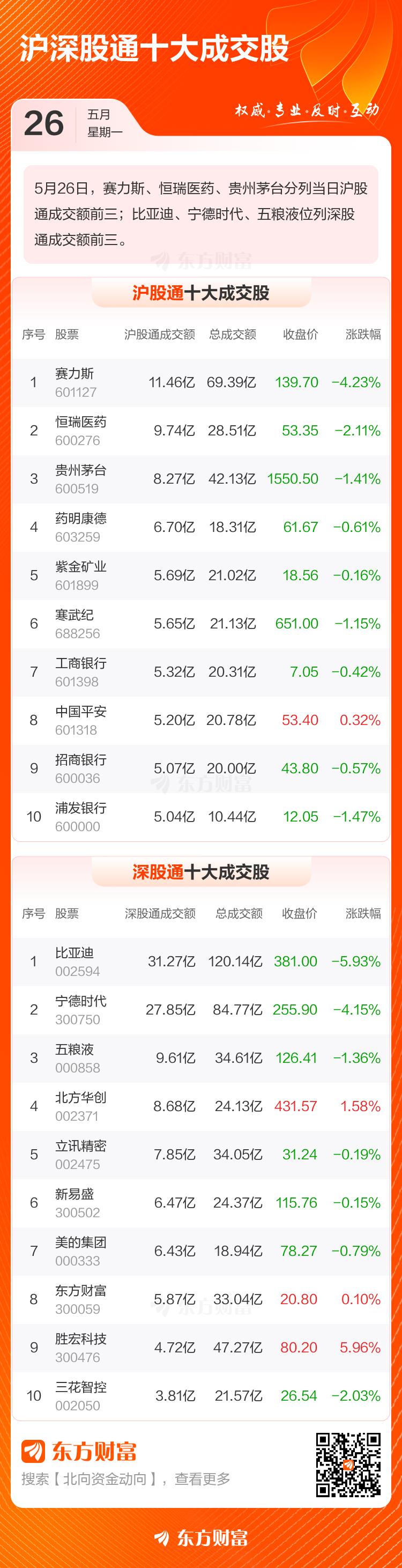 赛力斯、恒瑞医药、贵州茅台位列沪股通成交前三,成交额分别为11.46亿、9.74亿、8.27亿;比亚迪、宁德时代、五粮液位列深股通成交前三,成交额分别为31.27亿、27.85亿、9.61亿。
